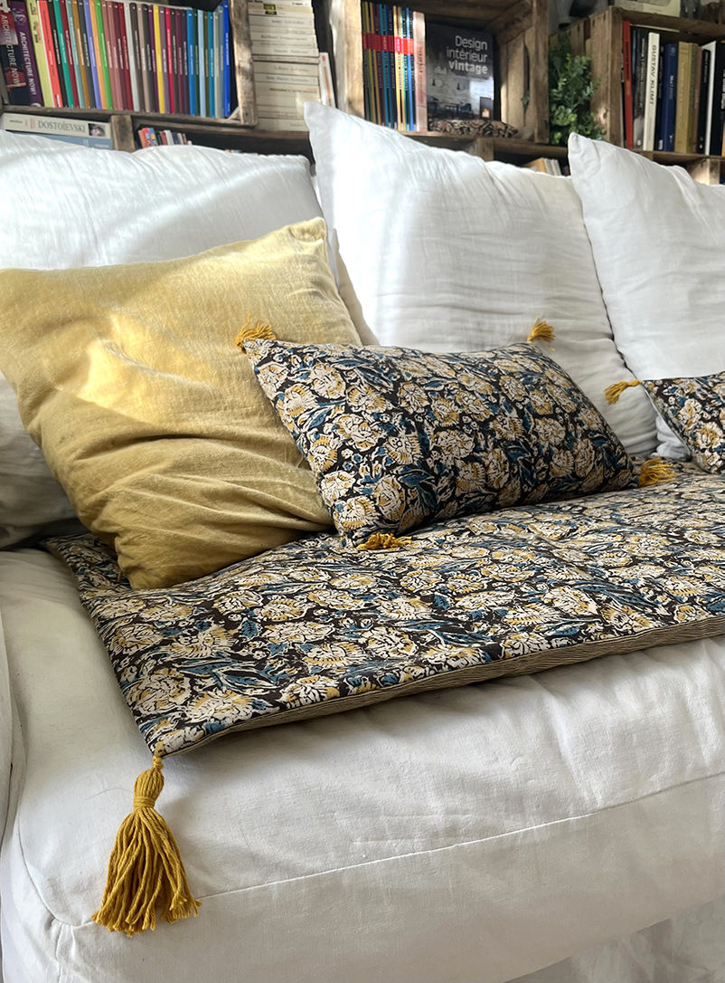 Joyeux et chaleureux, ce coussin rectangulaire attire le regard avec ses pompons espiègles. Le tissu en coton, imprimé à la main selon la méthode artisanale du block print, dévoile des motifs délicats qui racontent l’Inde traditionnelle. Chaque housse est confectionnée avec soin dans notre atelier lyonnais, pour un rendu authentique et unique. Idéal pour créer une atmosphère conviviale et colorée dans votre salon.